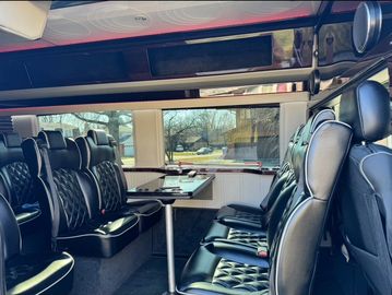 Blinds, tv, surround sound, table w/ cup holders, lights, Bluetooth, usb, sunroof, rear cargo luggage
